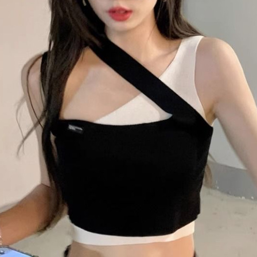 多巴胺女孩穿搭甜辣妹2023夏季新款假两件修身短款不规则挂脖上衣
